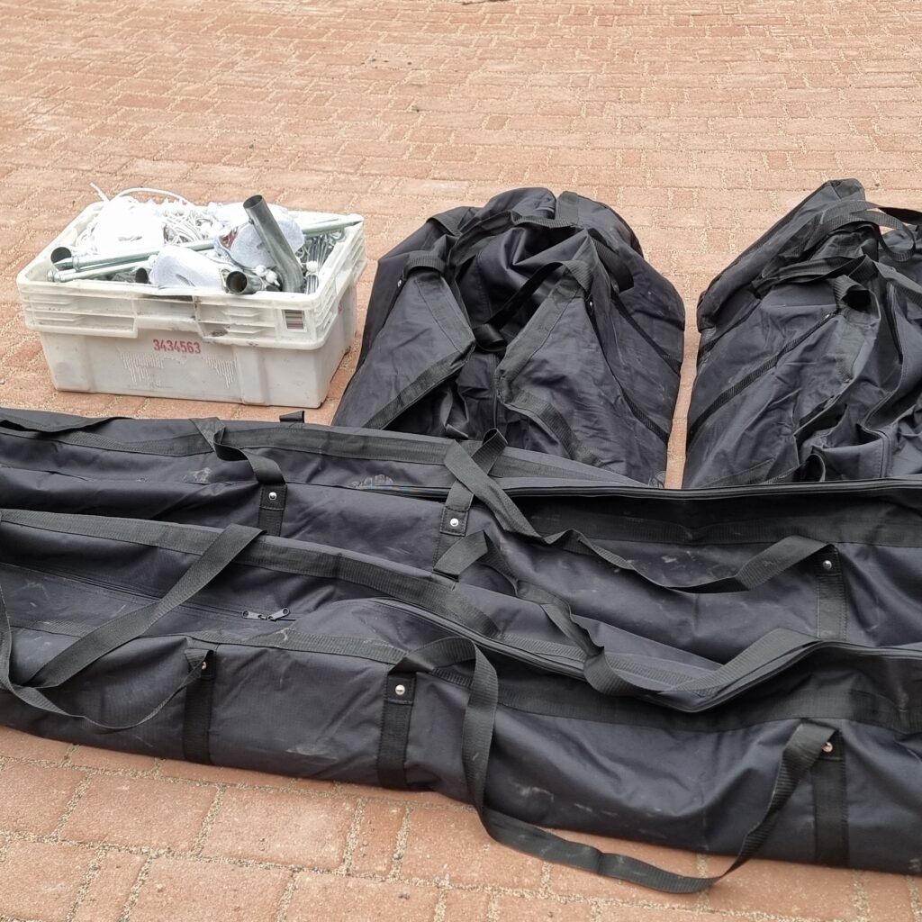 Lisävarusteena kantokassit ja turvapaketti, jolla teltta kiinnitetään maahan vakiota lujemmin.